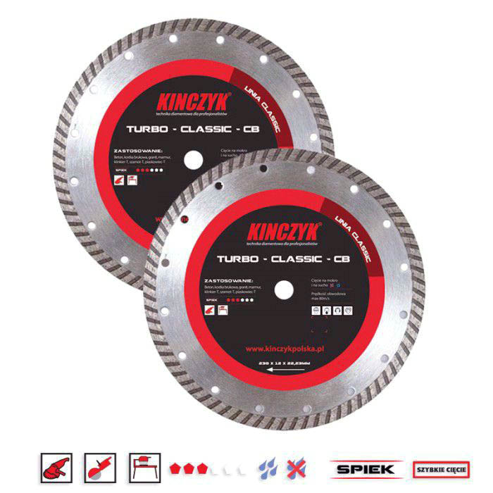 Tarcza TURBO CLASSIC CB o średnicy 115mm, z diamentem syntetycznym, gwarantuje wysoką wydajność i wyjątkowo szybkie cięcie. Sprawdzi się do pracy zarówno na mokro jak i na sucho. Tarcza producenta Kińczyk jest spiekana bezpośrednio na dysk, co pozwala na całkowite zużycie segmentu. Niezależenie od sposobu mocownia wydajność cięcia jest określona poprzez jakość diamentu syntetycznego i spoiwa. Umożliwia pracę ze szlifierkami kątowymi, piłami stołowymi i spalinowymi piłami ręcznym.