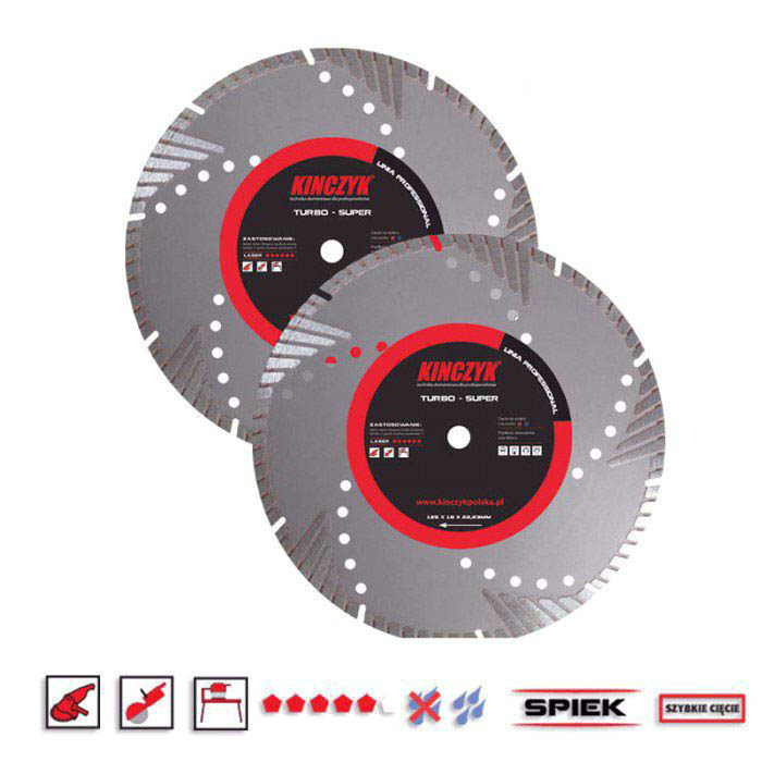 Tarcza TURBO SUPER o średnicy 125mm z diamentem syntetycznym gwarantuje wysoką wydajność i wyjątkowo szybkie cięcie. Sprawdzi się do pracy zarówno na mokro jak i na sucho. Tarcza producenta Kińczyk jest spiekana bezpośrednio na dysk, co pozwala na całkowite zużycie segmentu. Niezależenie od sposobu mocownia wydajność cięcia jest określona poprzez jakość diamentu syntetycznego i spoiwa. Umożliwia pracę ze szlifierkami kątowymi, piłami stołowymi i spalinowymi piłami ręcznymi.