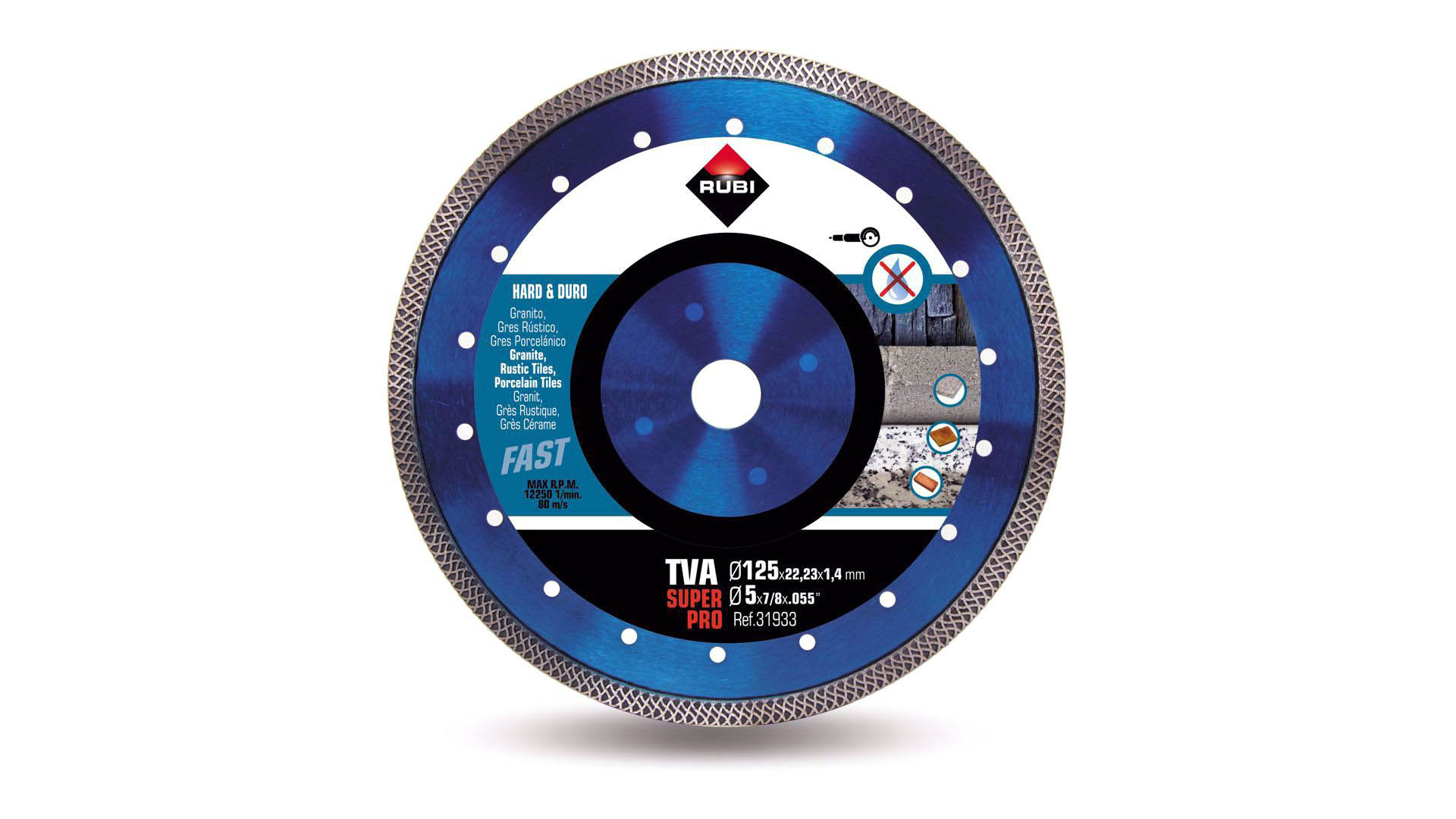 Ta konkretna tarcza łączy wszystkie pozytywne cechy tarczy TURBO, tzn. zmniejszenie naprężeń, przy równoczesnym uzyskaniu lepszej jakości cięcia.Podobnie jak w innych tarczach diamentowych, RUBI wykorzystuje technikę spawania laserowego w modelu TVA do połączenia obrzeża diamentowego do metalowego dysku. Spawanie laserowe daje największą gwarancję jakości i bezpieczeństwa przy produkcji tarcz diamentowych.Tarcze diamentowe RUBI oferowane są w dwóch klasach jakości: PRO oraz SUPERPRO.Tarcze jakości PRO zapewniają użytkownikom najlepszy stosunek jakości do ceny.Tarcze jakości SUPERPRO stanowią najlepszy wybór podczas najbardziej wymagających prac.Tarcze o grubości dysku mniejszej niż 2 mm nie są zalecane do cięć ukośnych.