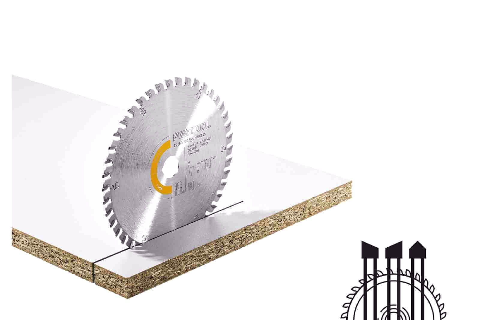 Piła tarczowa Festool o średnicy 160 mm, średnicy otworu 20 mm i szerokości cięcia 1,8 mm. Piła Festool posiada 42 zęby - przemienne oraz ząb dachowy, który odciąża zęby przemienne i zapewnia płynność cięcia, a także wysoką trwałość. Zęby tarczy wykonane zostały z węglików wysokiej jakości dla perfekcyjnych rezultatów. Kąt natarcia oraz kształt zębów został dopasowany do odpowiednich zastosowań. Piła tarczowa Festool zapewnia cięcie bez wyrw i idealnie sprawdzi się w połączeniu z zagłębiarkami Festool TS 55 F, TSC 55 K oraz HK 55 i HKC 55. Tarcza pilarska z łatwością poradzi sobie z cięciem płyt fornirowanych i powlekanych, drewna litego i dokładnym cięciem MDF.