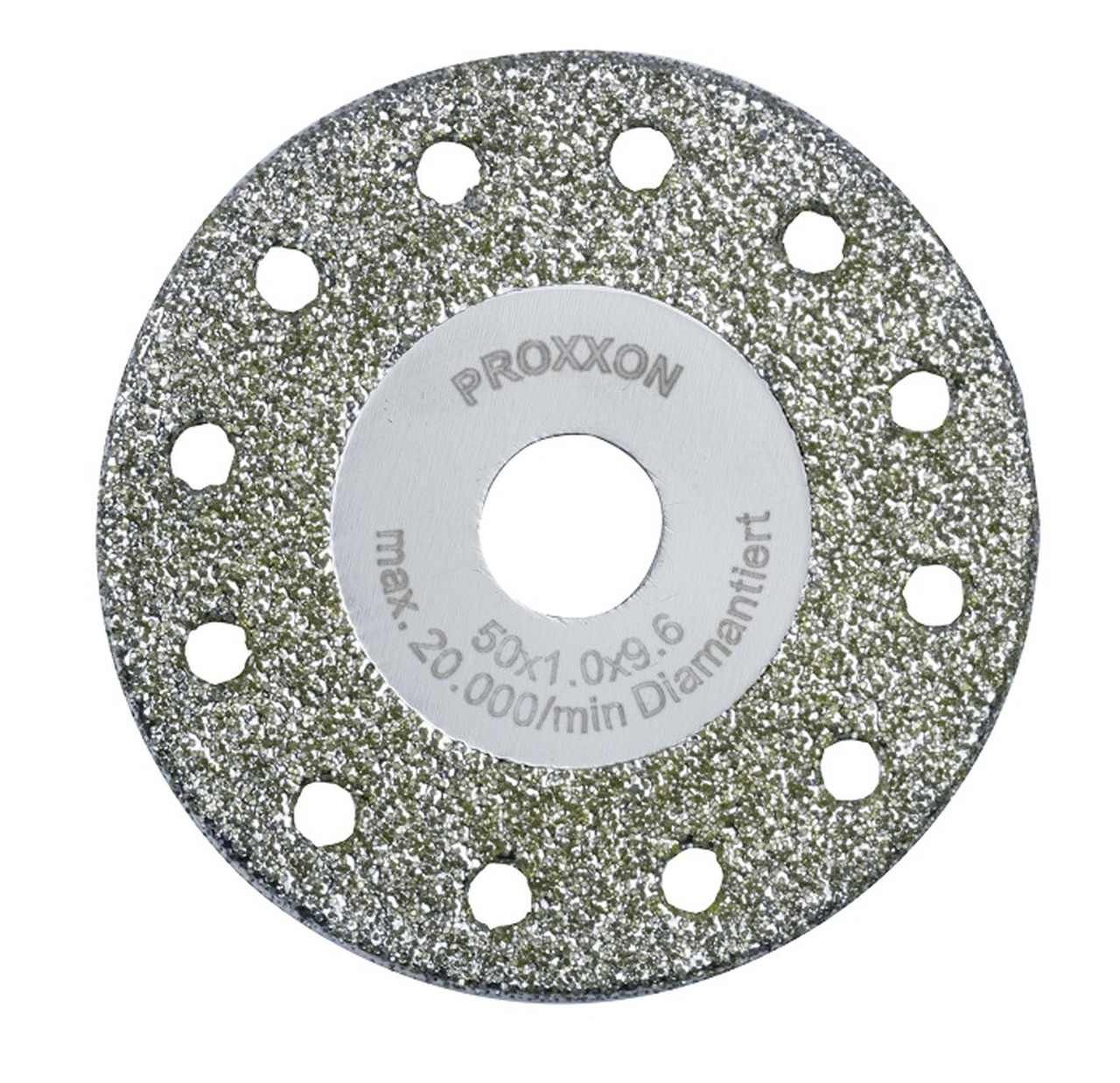 Tarcza diamentowa PROXXON o średnicy 50 mm przeznaczona do cięcia, szlifowania, obróbki zgrubnej twardych materiałów jak szkło, porcelana, ceramika i kamień. Ograniczenie nadmiernego nagrzewania się dzięki specjalnym otworom. Średnica 50 x 1,0 mm. Otwór 10 mm.