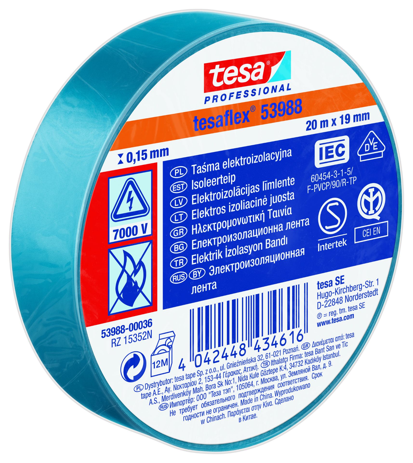 Taśma elektroizolacyjna tesa o szerokości 19 mm i długości 20 m w kolorze niebieskim, przeznaczona do bezpiecznej izolacji przewodów.