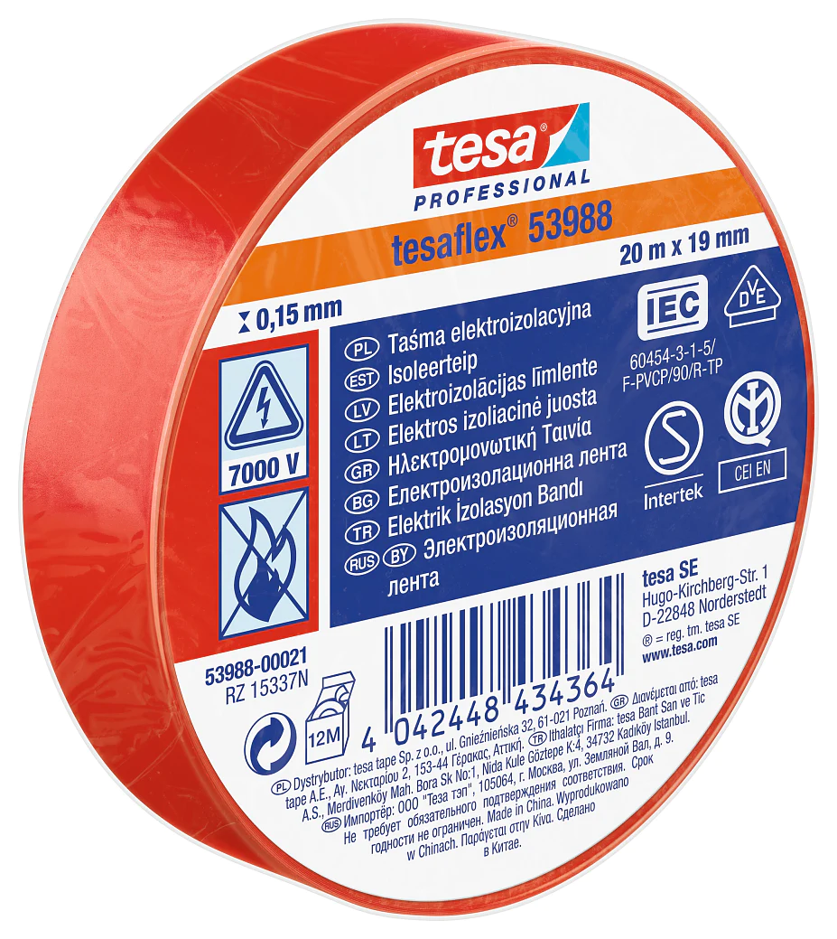 Taśma elektroizolacyjna tesa o szerokości 19 mm i długości 20 m w kolorze czerwonym, przeznaczona do bezpiecznej izolacji przewodów.