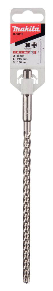 Wiertło SDS-Plus Makita Nemesis o średnicy 8 mm, długości roboczej 150 mm i długości całkowitej 215 mm charakteryzuje się wytrzymałością i sprawdzi się podczas wiercenie w żelbetonie, betonie, kamieniu, murze, granicie czy cegle. Wiertło posiada głowicę z węglika wolframu z końcówką centrującą, która umożliwia precyzyjne rozpoczęcie wiercenia. Optymalna symetria ostrzy 4 x 90° zapobiega rozwiercaniu otworu podczas natrafienia na zbrojenie. Sprawne odprowadzanie urobku zapewnia geometria spirali 4-rowkowej. Ponadto wiertło posiada duże ostrza dodatkowe z zakrzywionymi końcówkami, które wspomagają główne ostrze w szybkim wierceniu. Zaletą wiertła Namesis są znaczniki zużycia ułatwiające określenie odpowiedniego rozmiaru otworów dla kotew. Wiertło Makita Nemesis gwarantuje wytrzymałość i długą żywotność.