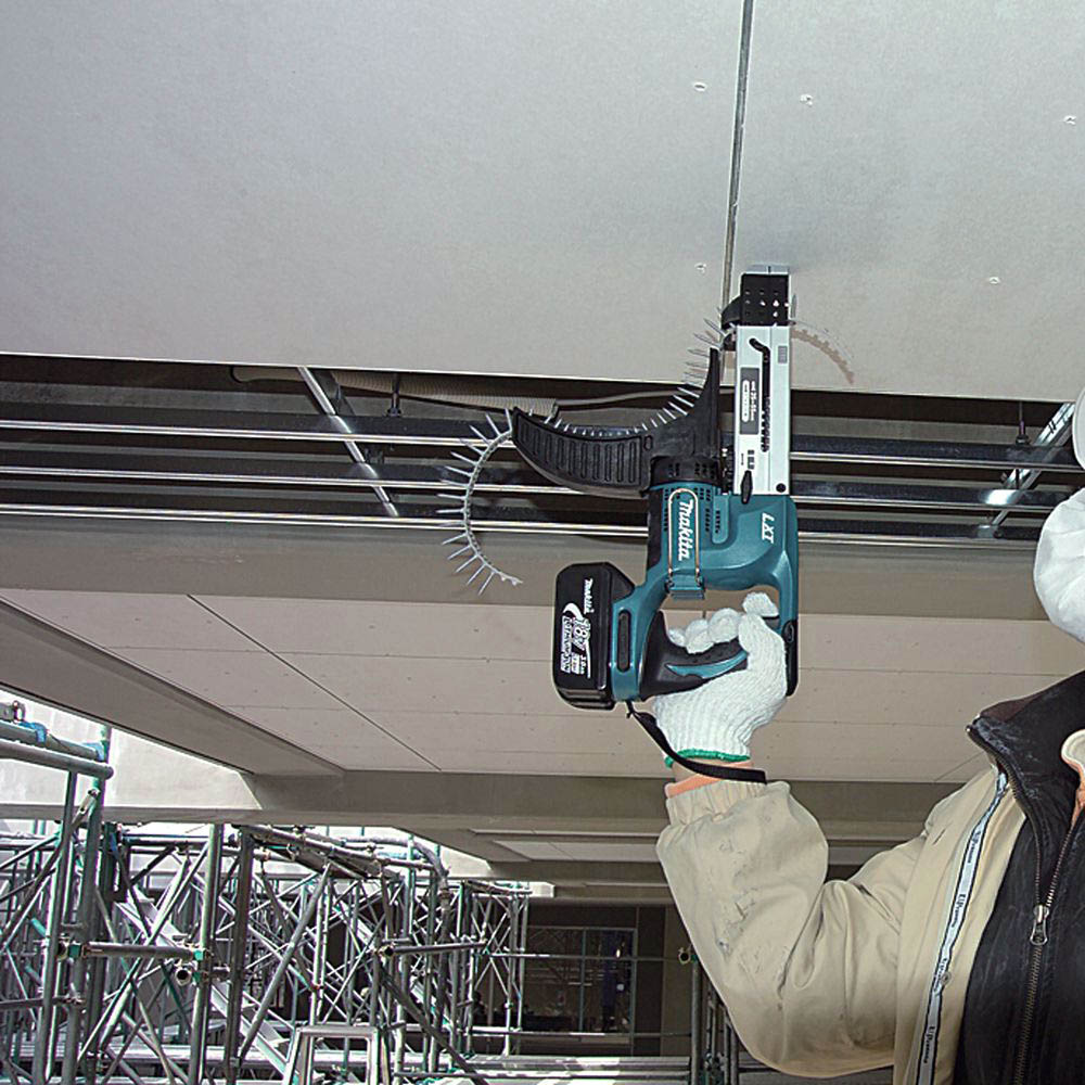 Akumulatorowa wkrętarka z magazynkiem LXT Makita gwarantuje szybkie wkręcanie, dzięki systemowi automatycznego posuwu. Aluminiowy mechanizm automatycznego podawania do taśm z wkrętami o długości 25 - 55 mm zapewnia wygodną pracę, a prędkość obrotowa 4 000 obr./min gwarantuje wydajność. Wkrętarka posiada precyzyjny przełącznik kontroli głębokości wkręcania oraz prowadnicę wkrętów zaprojektowaną w sposób zapobiegający plątaniu się taśmy z wkrętami. Ponadto narzędzie wyposażono w obwód ochronny akumulatora, który chroni przed przeciążeniem, nadmiernym rozładowaniem i przegrzaniem. Wkrętarka dostarczana jest w zestawie z dwoma akumulatorami BL1830 (18V / 3,0 Ah) i ładowarką DC18RC w wygodnej walizce transportowej.