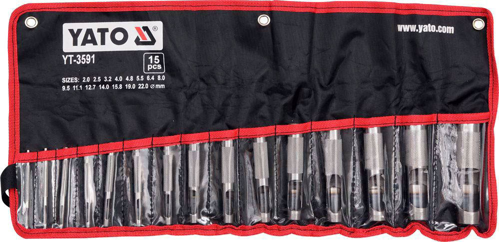 Wycinaki rurkowe wykonane z utwardzanej stali węglowej o symbolu #45 szlifowane i polerowane. Zestaw zawiera wycinaki o następujących średnicach 2 / 2,5 / 3,2 / 4 / 4,8 / 5,5 / 6,4 / 8 / 9,5 / 11,1 / 12,7 / 14 / 15,8 / 19 / 22 mm. Posiadają otwory do usuwania wyciętego materiał, powierzchnia chwytowa moletowana, pakowane w etui