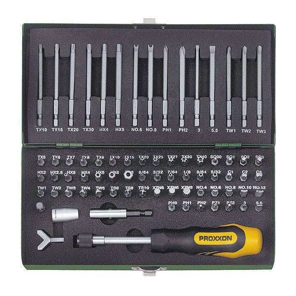Specjalne bity 1/4" (6,3 mm) w standardowej długości (25 mm) oraz długie dla głębokich otworów (80 mm). Wkrętak z dopasowanymuchwytem na bity. Uchwyt magnetyczny do pracy z wkrętakami elektrycznymi lub wiertarkami. Adapter z czopem zewnętrznymcztero- i sześciokątnym (male) oraz końcówką z czopem wewnętrznym cztero- i sześciokątnym (female). Specjalna końcówka do napinania haków śrubowych itp. Wszystko w stabilnej, kompaktowej skrzynce metalowej powlekanej proszkowo. Wszystkie elementy są wyraźnie oznaczone.