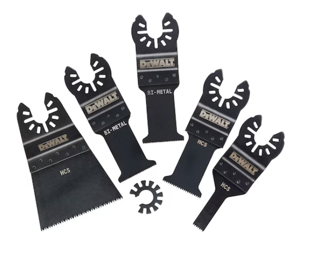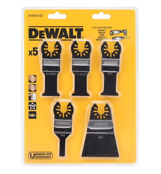Zestaw 5 brzeszczotów do narzędzi wielofunkcyjnych DeWalt przeznaczony do cięcia drewna, drewna z gwoździami, ścianek gipsowo-kartonowych, ścianek gipsowych i tworzyw sztucznych.