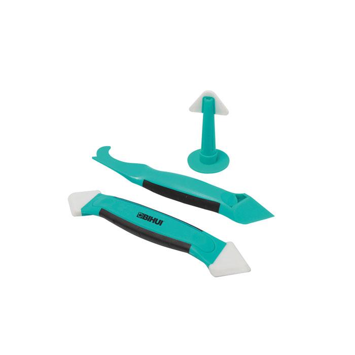 Prezentujemy kompleksowy zestaw do naprawy fug i uszczelniaczy, który umożliwia łatwe i szybkie nakładanie, modelowanie oraz usuwanie silikonu i innych uszczelniaczy. Zestaw zawiera profile wykończeniowe 3R (1/8R) i 6R (1/4R) do precyzyjnego modelowania, dyszę do kartuszy ułatwiającą aplikację masy uszczelniającej, a także noże do usuwania starego silikonu i uszczelniaczy.